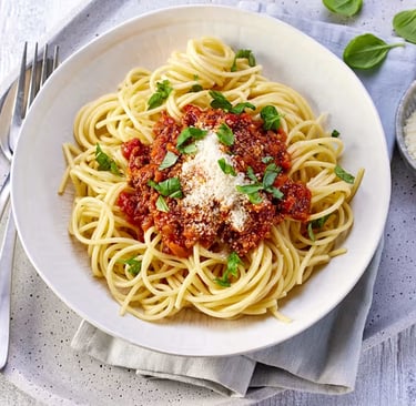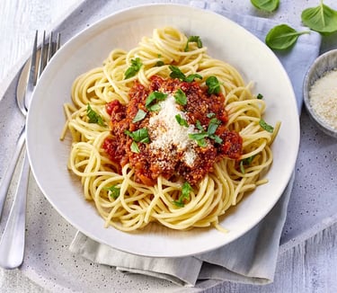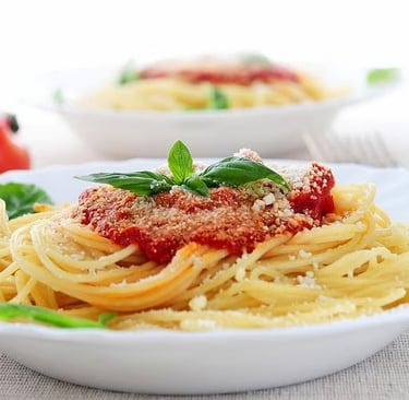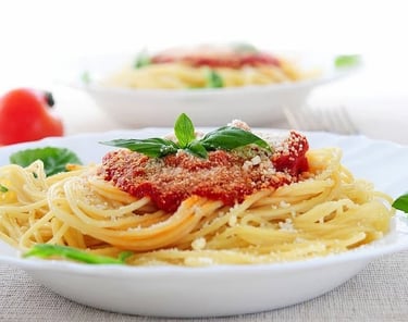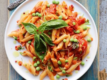 Sotelenmiş domates ile hazırlanan bu makarna, biber ve feslegen eşliğinde servis edilir.